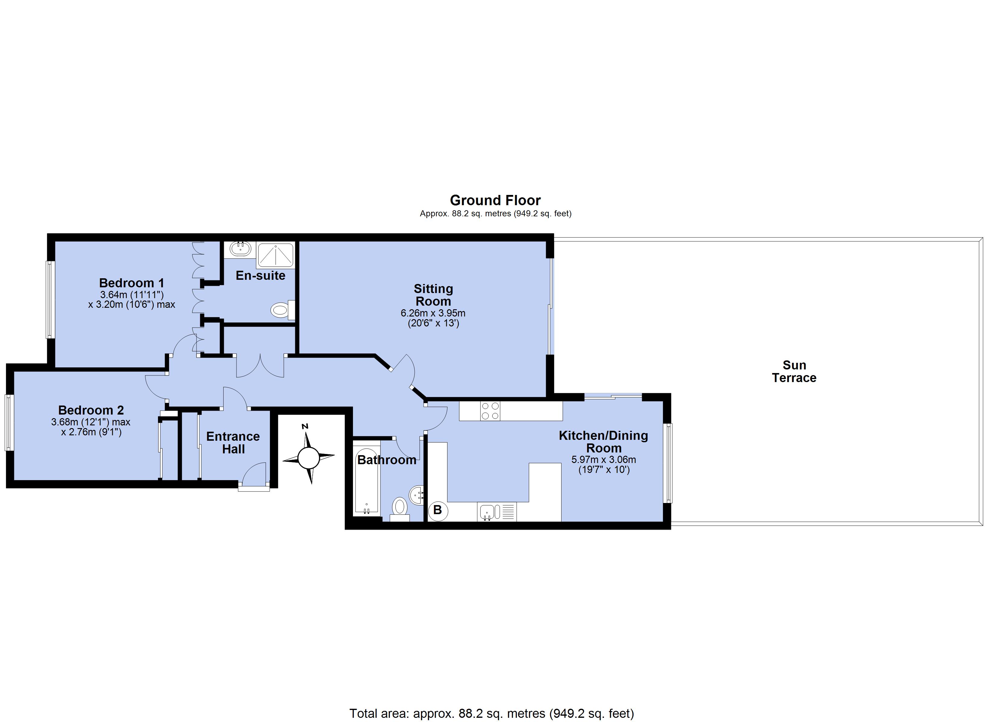 With an exceptional terrace capturing sunshine throughout the day, the apartment forms part of a well-respected development, positioned to the south west corner of the building. It is situated at entrance level, or has lift access from the parking area. The front door opens to a small vestibule with a double width cloaks cupboard and door to the inner hall, kitchen/dining room overlooking and opening to the terrace, sitting room also opening to the terrace, 2 bedrooms, en-suite shower room and bathroom. Communal gardens for the residents enjoyment.