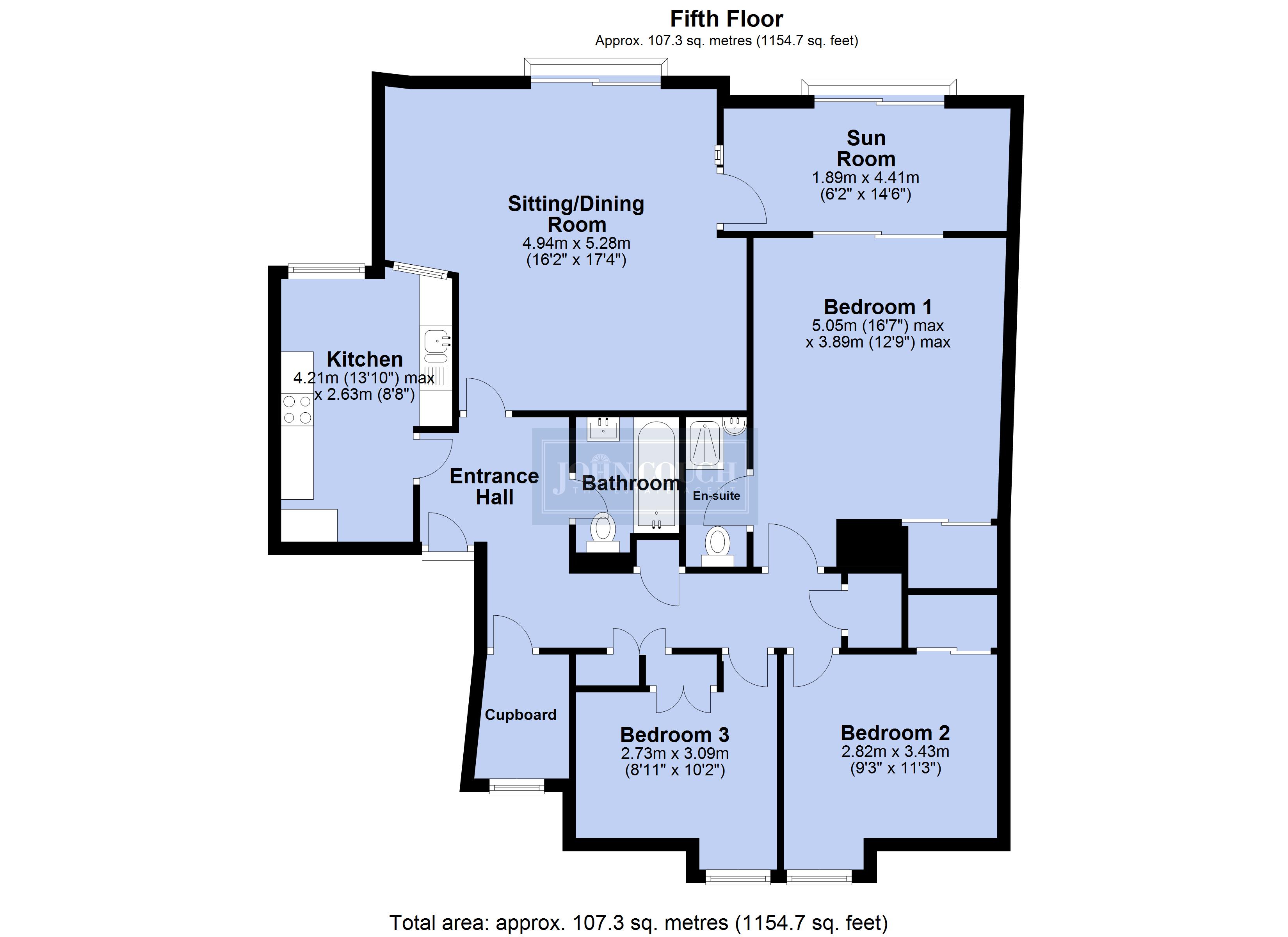 With stunning southerly views across Tor Bay, the apartment forms part of a landmark building, quietly located within a conservation area. With lift (and stair) access to the fifth floor, the front door opens to the hallway with the living/dining room immediately in front of you capturing the views stretching from the lighthouse at Berry Head, the open sea and the curve of the bay. The kitchen also enjoys the bay views, with bedroom one having both an en-suite shower room and enclosed sun room to the sea side, two further bedrooms and a bathroom complete the accommodation. Mature communal gardens, single garage to the rear.
