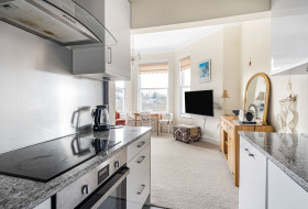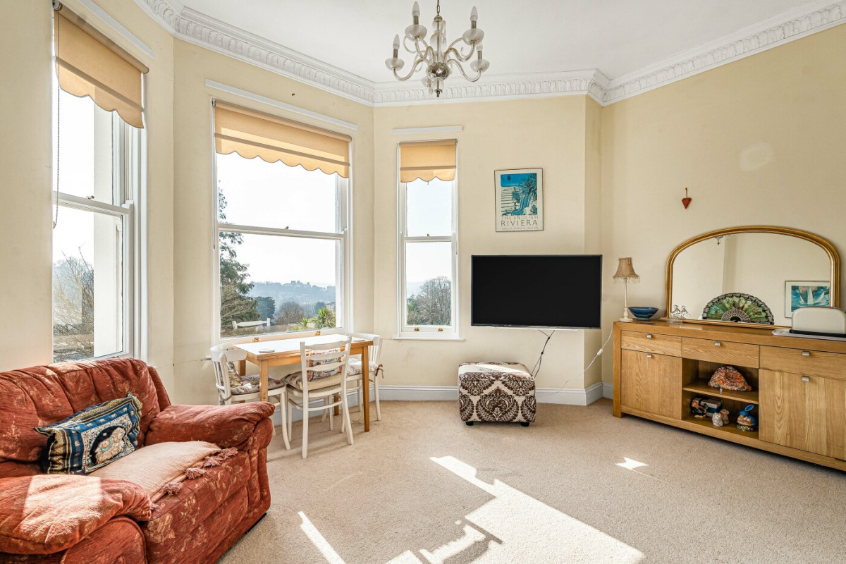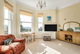 With light, character and distant views to the sea, the property offers a first floor flat, set within a distinguished Victorian villa, combining history with modern comfort. Ideal for full time living or as a second home, the apartment is accessed by a graceful staircase where the accommodation marries period charm with contemporary style. With a large bay window the open plan living area has a fine aspect over the gardens and the surrounding area to the sea, the principal bedroom, also with a bay window, is fitted with storage cupboards, continuing with bedroom two and a separate shower room. Mature gardens for the residents enjoyment, allocated parking space.